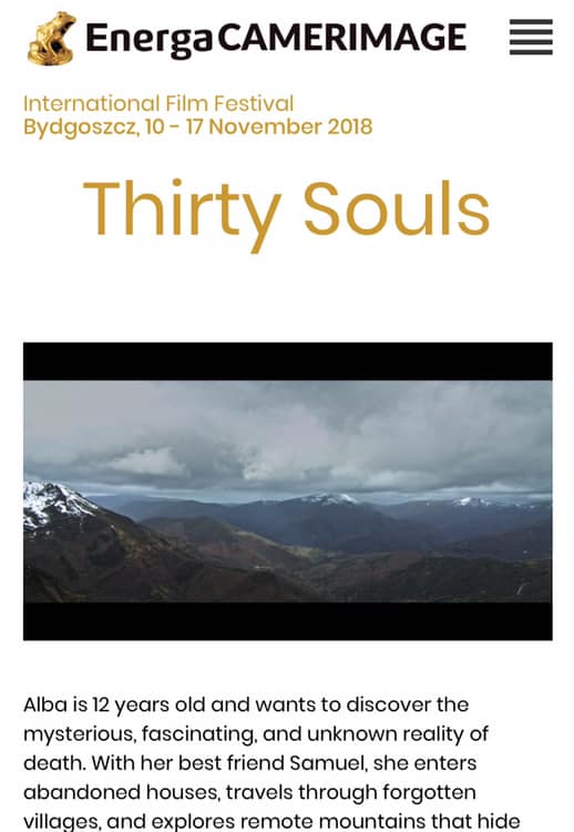 THIRTY SOULS AT CAMERIMAGE October 22, 2018 Thirty Souls is part of the prestigeous Camerimage, devoted to DOPs, and taking place in Bydgoszcz from November 10 to 17. All info: https://camerimage.pl News